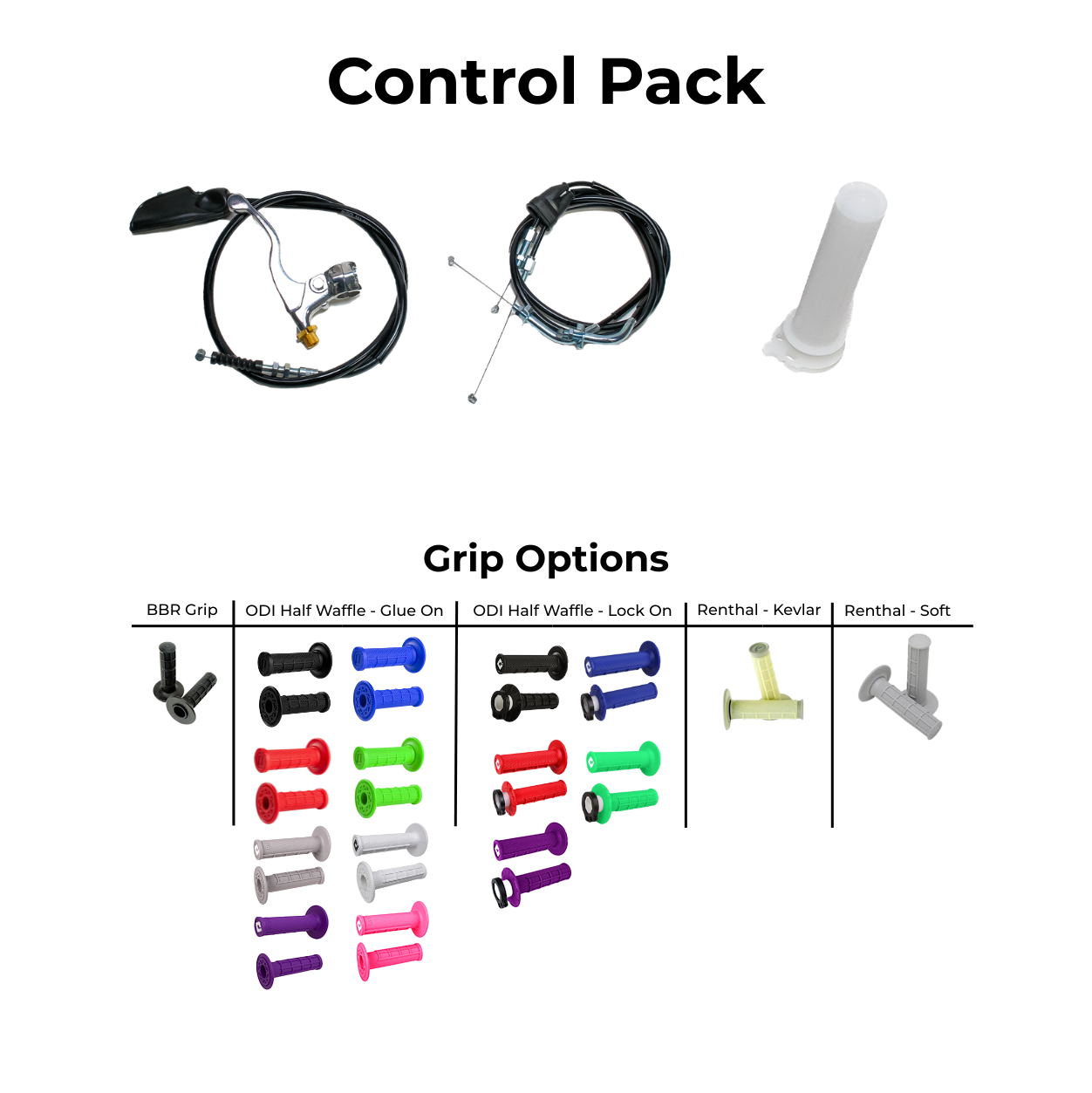 A must have for larger riders on the CRF110F. Replace the stock "low-rise" steel handlebar with a set of tall handlebars. The BBR throttle tube allows you to run normal sized motorcycle grips.