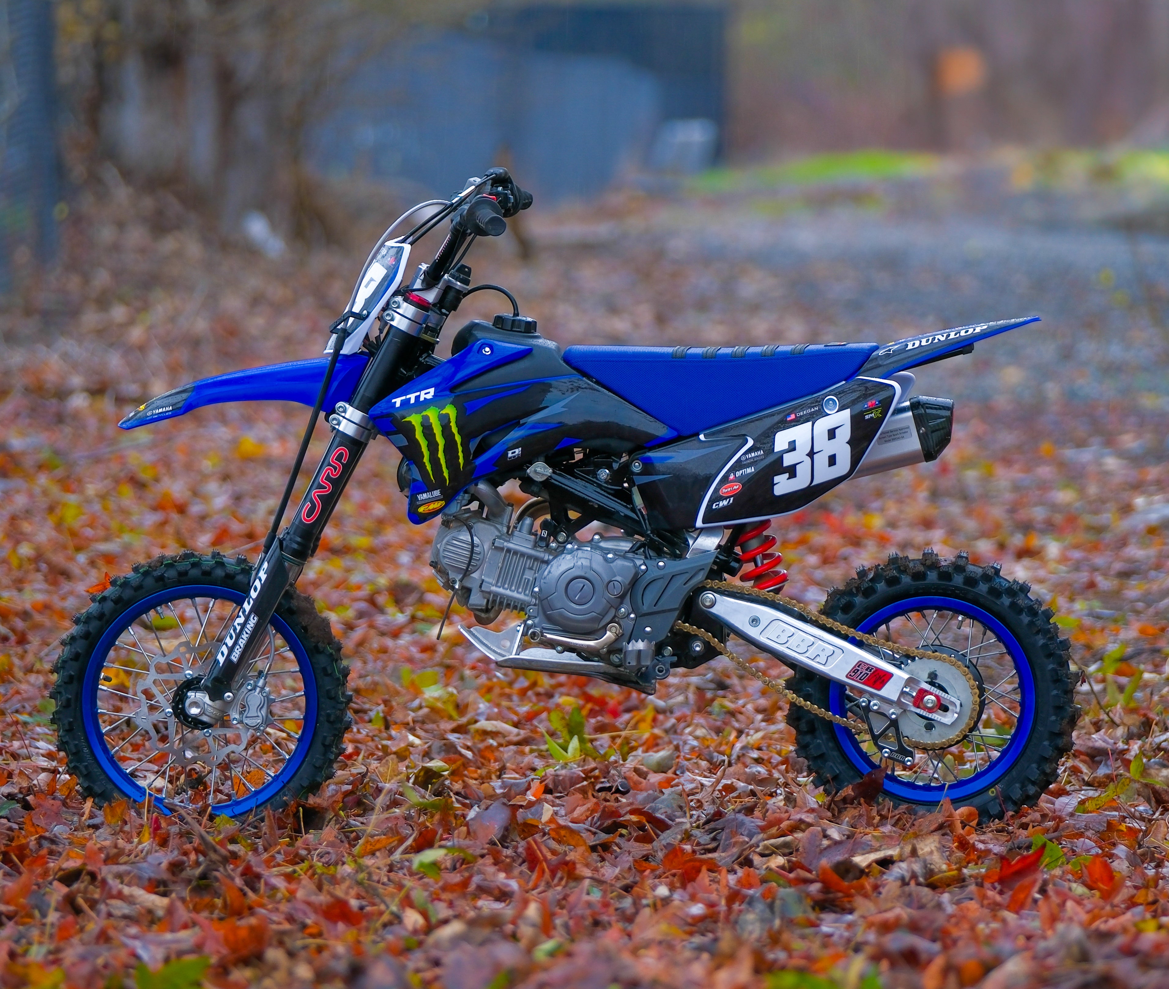 All new BBR MX style, vertical shock, rear end kit for the Yamaha TT-R110. We went back to the drawing board and completely redesigned the ultimate rear suspension upgrade for your pitbike. The swingarm is machined from 3 solid chunks of billet aluminum that fit together like a puzzle. Two high strength steel dowel pins, along with a press fit, ensure perfect alignment. Two 12mm bolts secure each side. The result is a strong and light swingarm that's survived the worst abuse BBR's test riders could throw at it. The side arms have been computer designed to be stiffer and stronger then any other swingarm we've ever built. That lets the bike track straighter through the whoops and exit turns smoother and more predictably than ever before.